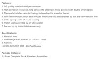 Introductions: In order to suppress the spring shock when inhaling the rebound after a shock and impact from the road, the Front Complete Shock Absorbers Assemblies is necessary for you to choose. After a rough road, although the shock absorption spring can filter the road vibration, but the spring itself will have a reciprocating motion, so the shock absorber is used to suppress this spring jumps. Made of high quality it is durable and sturdy in use. Features high corrosion resistance and long service life, it is an excellent product that you can't miss. The newly installed valve technology is based on the speed of the car. Come and order one to take a try! Brand Unbranded Type Car Parts UPC Does not apply MPN Does not apply Item.