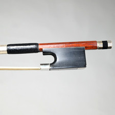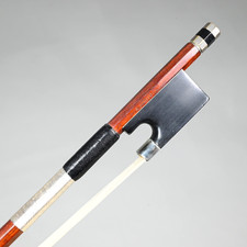This Standard-A bow was made in the late 1990s. The bow is in excellent, gently used condition (there is no visible wear on the thumb leather or the silver tinsel thread; the hair is ample). Round stick is made from beautiful, select grade orange-red Pernambuco wood.