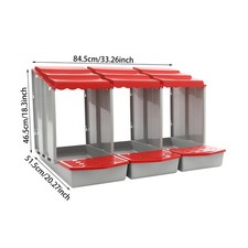 Specifications Material: PP Style: Modern Color: Red+Grey Process: Injection Molding Shape: Rectangular Assembly Required: Yes Number of Compartments: 3 Breed Recommendation: Chicken Mount Type: Freestanding, Wall-mounted Product Size: 84.5*51.5*46.5cm/33.26*20.27*18.3in Package Size: 51*32*26cm/20.08*12.6*10.24in Gross Weight: 4.2kg/9.26lbs Net Weight: 3.99kg/8.8lbs Package Included 1* 3-Compartment Chicken Nesting Box 1* English Manual Other Accessories for Assembly.