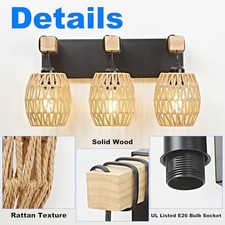 Standard E26 Socket — Dimmable Ready (Max 60W per Socket) — Fits standard E26 bulbs (LED/CFL/incandescent). (Bulbs and switch are not included.). 3-Light Bathroom Vanity Light Fixtures Over Mirror, Hand-Woven Boho Rattan Wicker Wall Sconce, Rustic Farmhouse Natural Wood Black Vanity Lighting for Bathroom Bedroom Hallway, E26 Base.