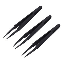 The tweezers are applicable for semiconductor, hard disk, electronic industry, etc. 3 antistatic tweezers. Made of black plastic, antistatic. Material: Plastic.