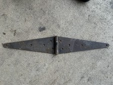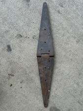 This product is a vintage metal strap hinge for a farm barn door. It features a rustic and salvaged appearance, with a rusted finish that gives it a unique and primitive charm. Perfect for those looking to add a touch of history and character to their home or garden, this vintage hinge is a one-of-a-kind piece that adds a rustic flair to any architectural or outdoor project. They are a lil rusty however still work great. They are 14” from the middle to each tip equals 28” long. 5” wide in the middle. You are getting 3 hinges. Some rust and pitting. One has a little paint on it