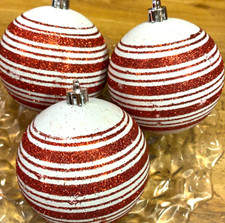 3 White & Red Glitter Striped Shatterproof Christmas Ornaments 3"