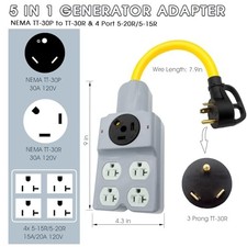 TT-30R Adapter: Features a 3 prong adapter design for secure NEMA TT-30P compatibility. 5-in-1 RV & Household Power Hub: 30A TT-30P plug to 4x 5-15R/5-20R outlets (15A/20A) + 1x TT-30R 30A port. Power RV systems and devices like fridge, tool, or heater simultaneously.