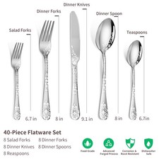 【40 Piece Silverware Set for 8】: This flatware set contains 8 dinner knives, 8 dinner forks, 8 salad forks, 8 dinner spoons and 8 dessert spoons. 【High Quality Material】: This silverware set is made of high quality stainless steel which is very durable, corrosion resistant, nickel free and will not produce residues or odors like other materials.