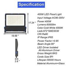 [IP65 WATERPROOF High Quality]: This 400W LED Flood Lights is made of IP65 Waterproof Driver with constant current AC90V-305V in high quality, it is suitable for both dry (indoor) and wet(outdoor) environments for a 50000 hours lifespan . [60000Lm High Brightness]: This Floodlights brightness is several times higher than traditional light bulbs,you can save up to 70% electricity. [ Wide Application]: The LED Flood lights are widely used in outdoor lighting like gardens, squares, billboards, factories, docks, stadiums and other places where super bright lighting is needed. [EXCELLENT HEAT DISSIPATION] : This Outdoor Lighting Floodlights 400W is made of die-cast aluminum design Radiator, provide an excellent heat dissipation and extend the life of lamp bulbs. [WIDE BEAM ANGLE 90° ].