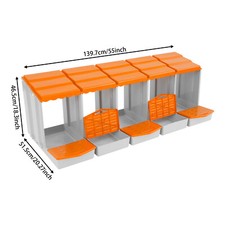 Application It can be used in homes, outdoors, farms, chicken houses, backyards, courtyards, etc., for hens, etc. to lay eggs. Specifications Material: PP Style: Modern Color: Orange+Grey Process: Injection Molding Shape: Rectangular Assembly Required: Yes Number of Compartments: 5 Breed Recommendation: Chicken Mount Type: Freestanding, Wall-mounted Product Size: 139.7*51.5*46.5cm/55*20.27*18.3in Package Size: 51*32*38cm/20.08*12.6*14.96in Gross Weight: 6.9kg/15.21lbs Net Weight: 6.55kg/14.44lbs Package Included 1* 5-Compartment Chicken Nesting Box 1* English Manual Other Accessories for Assembly.