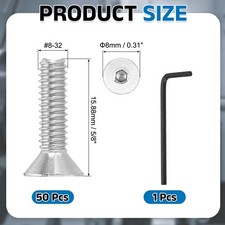 This precision countersunk screw has a wide range of applications and is very suitable for the mechanical industry, confidential instruments, electronic products, home appliances, etc. It is widely used in the manufacture and assembly of wooden furniture such as cabinets, chairs, tables, shelves and other household items.SpecificationColor: SilverMaterial: 18-8 Stainless Steel 304Thread Type: #8-32Length: 15.88 mm / 5/8"Head Diameter: 8 mm / 0.31"Packing List: 50 Pcs x Flat Head Socket Cap Screws + 1 Pcs x 3/32" / 2.38mm Hex Key WrenchAdvantage1. The flat head socket cap is made of 18-8 stainless steel 304 , with a smooth surface without burrs, high strength, corrosion resistance, high and low temperature resistance, moisture resistance and rust resistance, suitable for various extreme environments, strong and durable.2.