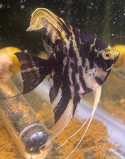 These angelfish were raised in my personal aquariums and are healthy, active juveniles that are well established in the aquarium. You are purchasing a group of 6 Black Marble Angelfish (Pterophyllum scalare).