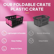 PLASTIC STACKABLE STORAGE CRATES: Constructed from durable plastic, the foldable crates are designed to support heavy loads while remaining lightweight. STRONG MILK CRATES FOR STORAGE: Designed with stackable grooves and reinforced edges, ensuring stable stacking in both folded and open positions.