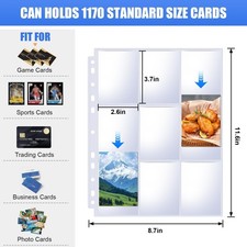 Professional Protection for Your Card CollectionGive your valuable cards the premium storage they deserve. Each pocket perfectly fits standard 2.5" x 3.5" cards and allows back-to-back storage for maximum efficiency.Universal 11-Hole Binder FitThese trading card sleeves for 3 ring binder feature a universal 11-hole design that securely fits 2, 3, 4, and 11-ring binders.