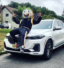 6ix9ine custom helmet. Made to order This is a 16 inch unit with custom graphics for the tattoos hand made and drawn out one by one to look like the dummy boy version of 6ix9ine when he dropped the album to match the album cover , The hair is hand braided and attached . It has led eyes with remote control , rechargeable battery pack and led controller . It has carbon fiber trim on the bottom . Is one size fits all fully adjustable.for any adult to wear . Contact me with any questions
