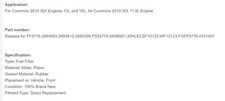 Introducation: A fuel filter is a filter in the fuel line that screens out dirt and rust particles from the fuel, normally made into cartridges containing a filter paper. They are found in most internal combustion engines. Fuel filters serve a vital function in today's modern, tight-tolerance engine fuel systems. Application: For Cummins 2010 ISX Engines 15L and 16L, for Cummins 2010 ISX 11.9L Engine. Part number: Replace for FF5776,2864993,2893612,3685306,P555776,SK48561,30HL62,SF10123,WF10123,FGFF5776,4331007 Specification: Type: Fuel Filter Material: Metal, Paper Gasket Material: Rubber Placement on Vehicle: Front Condition: 100% Brand New Fitment Type: Direct Replacement Features: 1. This fuel filter is designed for diesel engines. 5 Micron rating and .