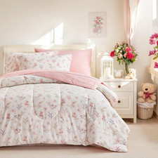 7Pcs Cotton Comforter Sheet Set for Girls, Queen Size Bed in a Bag, Pink Floral