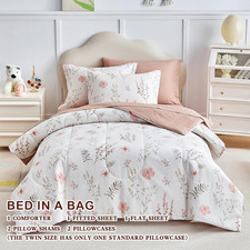 7Pcs Cotton Comforter Sheet Set for Girls, Queen Size Bed in a Bag, Pink Flowers