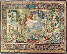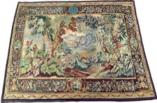 "Beautiful antique French tapestry depicting a scenic view including magnificent art nouveau motifs, beautiful trees, and greenery. A chic, neutral antique piece to add elegance to any room.". "This is an Antique French 19th Century wall tapestry depicting a central scene motif with a house surrounded by forest and floral motifs.