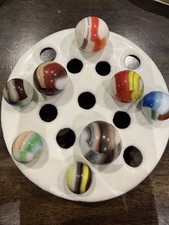 This is a lot of vintage Marble King marbles ranging in size from .61 to .99 inches. These marbles are described as being in near mint condition with minor flea bites and a few ticks. The Marble King brand is well-known for producing high-quality marbles, making this lot a desirable option for collectors or enthusiasts looking for unique and vintage pieces to add to their collection.