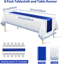 8Pack Disposable Plastic Tablecloths and Satin Table Runner White and Royal Blue