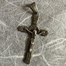 The product is a 925 sterling silver crucifix pendant necklace, designed in a vintage chapel style. This piece of jewelry is inspired by Christianity and serves as a symbol of faith and spirituality.