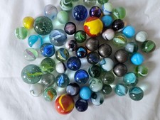 APPROX 60 MARBLES. STEELIES, RED AND YELLOW, OPAQUE GLASS ET AL.