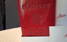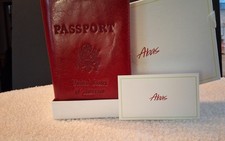 The ABAS Passport Cover in red leather is a stylish and high-quality accessory for holding your passport securely while traveling. Made in the United States by the brand ABAS, this bifold cover is designed to protect your passport and make it easily accessible during your journeys. The red color adds a touch of sophistication, making it a practical and fashionable choice for any traveler looking to keep their identification safe and organized. Boxed with felt cloth. Box has slight imperfection, see photos. Otherwise perfect, unused condition.