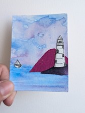 ACEO Original Art Card Drawing Mixed Media Lighthouse Signed by artist