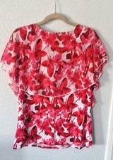 Type: Layered career blouse. Color: White and Red/Pink Floral. Sleeve Type: Short flutter sleeve layered over sleeveless tank. Size: Large. Features: Stretch. Sheer layered overlay. 3 rhinestone faux buttons in front.