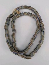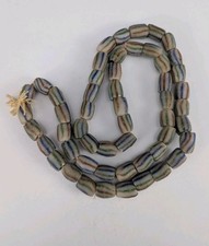 This product is a 53-piece, 38 inch long strand of handmade Venetian African trade beads, featuring a unique color combination. Primary gray glass with red and blue stripes. Made of glass in Italy, these rare beads are a collectible piece from the early 19th to mid-20th century. Shipping within the USA only with USPS ground advantage.