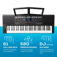 580 premium sounds with Layer and Split mode functionality, 64-note max polyphony, plus the ability to sample your own sounds using the built-in microphone. Electronic keyboard with 61 full-size keys, user adjustable touch response, pitch-bend wheel, X/Y performance touchpad, Mix mode with DJ-style FX, and 30 different styles with 5 sections each.