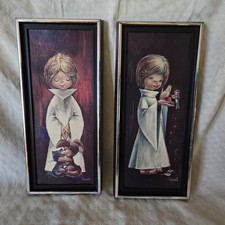 This set of 2 vintage wall art pieces features an altar boy, girl, and animals design from the 1960s. Made by I. Vemet, these collectible items perfectly capture the retro and mid-century aesthetic of the era. Perfect for adding a unique touch to any home decor, these pieces are sure to be a conversation starter among vintage enthusiasts. Sizes of both pics: 7.5 x 16.6 x 1 There are scratches on the plastic frame.