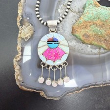 Amy Quandelacy Zuni Sterling Sunface Opal,Turquoise,Coral Decorated Pendant