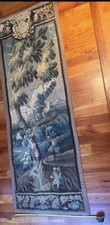 Tapestry is 8”5” x 3’2”. It has been professionally prepared and mounted, and has a linen backing and brass rod and finials. I have the hanging hardware for the rod. The inclusion of exotic-looking birds (the two white birds resembling cranes or herons, and the one red-breasted bird) and stylized, large leaves suggests it belongs to the sub-category known as Verdure Exotique.