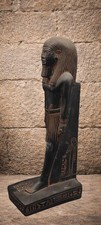 The elegant proportions and carved details give this statue a strong decorative presence suitable for collectors of Egyptian art, mythology enthusiasts, or interior display. Hieroglyphic motifs decorate the base and rear pillar, adding an authentic ancient Egyptian visual character to the sculpture.