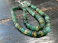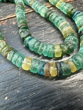 The glass ranges from sea‑green and aqua to deep olive and yellow‑green, giving a subtle multi‑tone effect suitable for artisan designs. • Shape: Rustic heishi / disc beads. • Material: Recycled ancient Roman glass (Afghan origin).