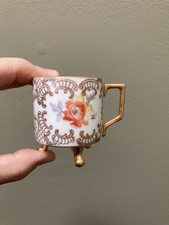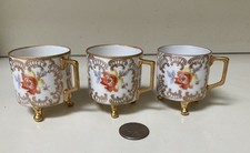 Estate find 3 demitasse cups produced by Mitterteich in Bavaria, dated from 1930s. Features a distinctive three footed base with gold gilded details, and hand painted floral as well as scrolling patterns, so pretty, each one is 2.25” high, 2” wide not including a handle, all in excellent vintage condition, please view the photos for details, sale as is, shipping with USPS ground advantage service.