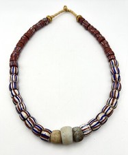 Antique American Flag Striped Red Core Venetian Glass Trade Beads along with brick colored trade beads and yellow end trade beads strung on raffia. American Flag Striped Red Core Venetian trade beads, Africa, late 1800's to early 1900's. Some pitting and wear due to age. Beads size varies- most measure approximately 1/2 inch - please see photos for details.