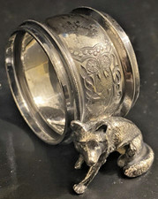 We have a lovely antique American Silver Plated Figural Napkin Ring which appears to be unbranded although clearly fits into the figural american napkin rings from that era and featuring a dog, possibly a german sheppard. The ring itself is doubled edged and adorned with intricate floral engravings....measures 10cm x 6.5cm x 6cm.