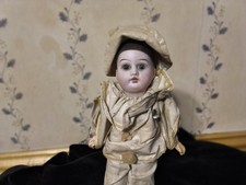 He has a bisque head. Looks like it is marked 185. Not sure what German factory made him. He has a nice face with set blue eyes. Cute clothing is original with 2 pompoms it appears to be sewn on.