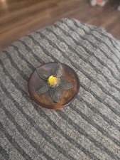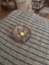 The product is an antique shank button made of Bakelite with a metal floral escutcheon, featuring a round shape and brown color. This original button, manufactured before 1930, is suitable for various uses such as trays, plates, button collecting, coats, and costumes. Its unique design and historical significance make it a desirable piece for collectors and enthusiasts of antique sewing memorabilia.