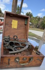 Estate Palm Beach Florida Queensberry Victorian Brass Sextant by John Sewill, 61 South Castle St., Liverpool. Maker to the Admiralty, with rosewood handle, spare lenses, in fitted figured mahogany case with retailer label Mahogany case is partly damaged Oxidation