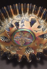 Antique Dugan Marigold Carnival Glass Bowl Grape Delight 8.5" Ruffled EXC