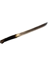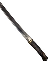 This listing is for an intriguing antique Japanese tanto-style short sword or dagger. The blade features a distinctive profile with a single edge and a visible hamon-like pattern, suggesting traditional forging methods. The handle is wrapped in aged dark material, possibly leather or cord, with brass or bronze fittings, exhibiting a rustic and primitive aesthetic. This piece shows signs of age and wear consistent with its vintage, including patina, some pitting on the blade, and wear on the handle wrap. It represents a unique collectible for enthusiasts of Japanese blades and historical weaponry. Please examine all images carefully for condition and details.
