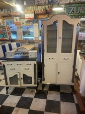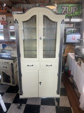 No makers mark on either cabinet. I can’t find another matching pair like them. They are a cream color. Drawers close snuggly against cabinet wall. The glass shelves in both are pretty thick with a rounded front edge that has a beveled upward lip.