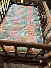 Antique rocking crib. It’s amazing how they made these it has a nice matching mattress ; it’s beautiful and very clean. It’s a full size baby crib approximately 42” long x 28”