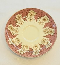 The Antique Royal Worcester England tea cup saucers set of 3 features a beautiful red floral pattern with gold trim on high-quality porcelain. The set includes two-piece saucers, perfect for serving tea in style for any occasion. The vintage design, painted by hand, adds a touch of elegance to your tea-drinking experience. Made by the prestigious brand Royal Worcester, this set is a collector's item for those who appreciate fine dinnerware and serveware. Please hand wash only to preserve the original charm of this classic and timeless set.