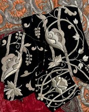 THREE Antique Spanish Orphrey Fragments Black velvet decorated with raised padded three dimensional Silver metal embroidery Dating from late 19th century Good antique condition throughout. Please study photographs as they do form a very important part of the description SIZES 12 inches x 9 inches. 10inches x 6 inches. 6 inches x 5 inches (30cm x 23cm) . 25cm x 15cm , 15cm x 13cm) F6782