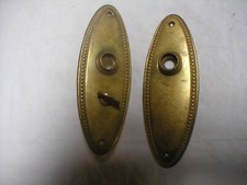 Antique Solid cast Brass Doorplate Pair. Excellent quality. Knob holes are different heights. 6 13/16" x 2 15/32". From center of spindle hole to center of twist knob it is 1 5/8". Twist knob spindle is 3/16" thick.