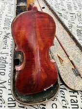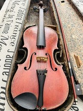 Antique violin and bow in original wooden case given me by my Great Grandmother. Means a lot to me, but couldn’t find trustworthy person to restring. Needs new strings on both violin and bow, and all could use refurbishing. Marked inside “Antonius Stradivarius Cremonensis Faciebal Anno 1716” and initials “AS” with cross between initials encircled. Some small scuffs on violin, pictured, and black wooden case is very old with torn paper, torn straps and dilapidated padding inside, all pictured.