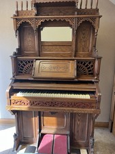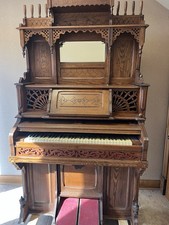 This is a stunning antique organ with an ornate carved wood cabinet, mirror, decorative fretwork, and original details. It has dual foot pedals and ivory-style keys, with a hinged cover to protect the keyboard when not in use. The craftsmanship and detail make it not only a musical instrument but also a gorgeous statement piece of furniture. -Solid wood with intricate carvings -Beautiful mirror and shelving on the top section -Original foot pedals and keys -Approximate height: over 6 ft tall It has been well cared for, Perfect for collectors, antique lovers, or as a decorative showpiece in your home.
