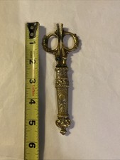This product is an antique pair of Victorian ornate heavy brass handled scissors with a matching sheath. These dressmaker's scissors are original and date back to the pre-1930 era, making them a rare and unique find for collectors or sewing enthusiasts. The intricate design and craftsmanship of the brass handles add a touch of elegance to this vintage tool, making it both functional and decorative for use or display.